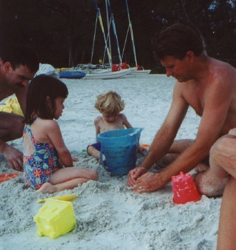 "We are looking at our sand castle and our bucket. We have filled it all up. It's not quite filled up. We are standing in the soozing sand."