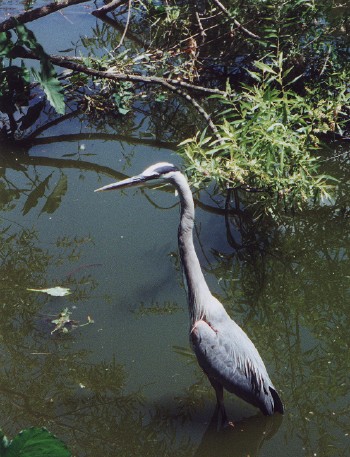 "Dad took a picture of a bird and it is a blue heron and it is standing in some water."