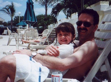 "I am sitting in a chair with Dad. I am drying off with a towel. I like to pretend it's my mittens or my clothes or you could call it my dress."