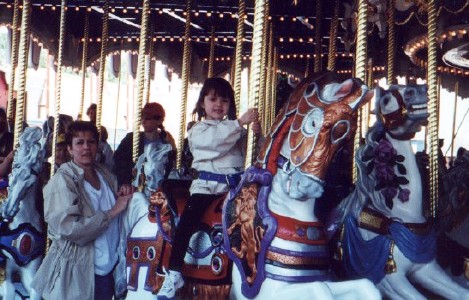 "I am riding a beautiful horse on a carousel. It's a Cinderella carousel. It's me and Mom."