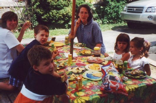 A summer picnic with school friends and moms. Left to right: Rachel's mom, Aiden, Aiden's brother Drew, Mrs. D., me and Rachel.
