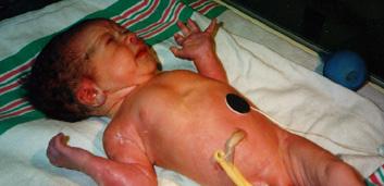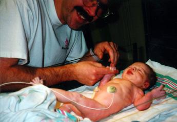 One more shot by daddy. The little silver disc is a temperature sensor. They wanted to keep my temperature very constant while I was being checked out. Finally I'm checked out, had my APGAR (9, thank-you), got wrapped up and get back to mamma. She was whipped, but still very happy to get me back.
