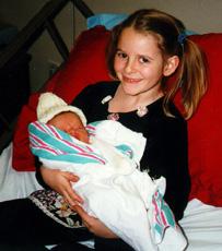Here is Elaina holding me. Daddy says she's pretty excited about having a younger cousin to help take care of. She'll probably be baby-sitting with me when mom and dad go out.