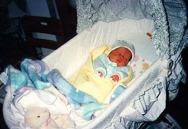 My friend Delaney's Mom loaned us this cool bassinette. I'm glad I had it 'cause then I got to sleep in Mom and Dad's bedroom. I felt pretty cozy in it, too.
