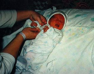 Here I am just home from the hospital. Mom still has her ID bracelet on. Hard to believe that my hat was so big on my tiny head.