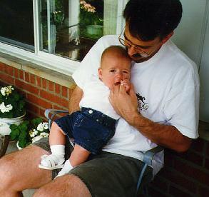 Here I am in my denim shorts and summer sandals. Dad's got his on, too. Here we are hanging out at Grandma Olga and Grandpa Sam's house. We went there a lot in the summer since they love to see me.