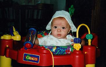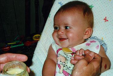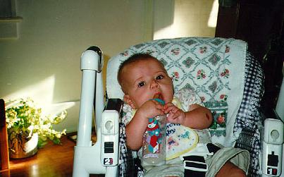 July is when I first started eating solid foods. I liked about everything at first. Here we are eating applesauce at Grandma and Grandpa's house. No doubt there is a big crowd watching.