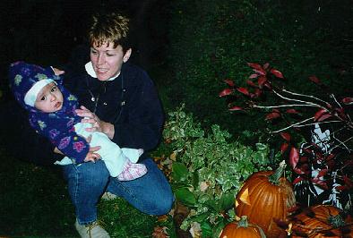 We went out in the country and bought some big pumpkins. Then one night we cut holes in them and made faces on them. Here we are seeing how they look outside. Mom really gets into this stuff.